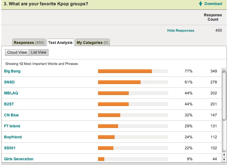 CSA's Scholarship Survey Results: Favorite Kpop Groups (As Of 8/8/2011) Posted by Crystal S. Anderson on August 8, 2011July 13, 2014 Don’t have time to scroll through the survey results? Here are the results for our favorite question: What are your favorite Kpop groups? 18 and over (Top 9) 16 and over (Top 9) Share this: Share on Facebook (Opens in new window) Facebook Email a link to a friend (Opens in new window) Email Share on X (Opens in new window) X More Share on Tumblr (Opens in new window) Tumblr Share on Reddit (Opens in new window) Reddit Share on LinkedIn (Opens in new window) LinkedIn Like Loading... Related