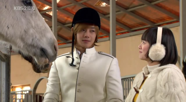 So we see the horse race, the car race and finally the swimming test. During the horse race, you do see that really aggressive side of Jun Pyo, but these bouts are becoming fewer and fewer, which means that he’s GROWING. Every time he has to encounter some situation that Jan Di finds herself in, he does grow and change as a character. She, however, does NOT! Completely unrelated note: I’m digging Ji Hoo’s equestrian wear! Are we supposed to draw some conclusions from the fact that he’s wearing white and Jun Pyo shows up in Johnny Cash black?